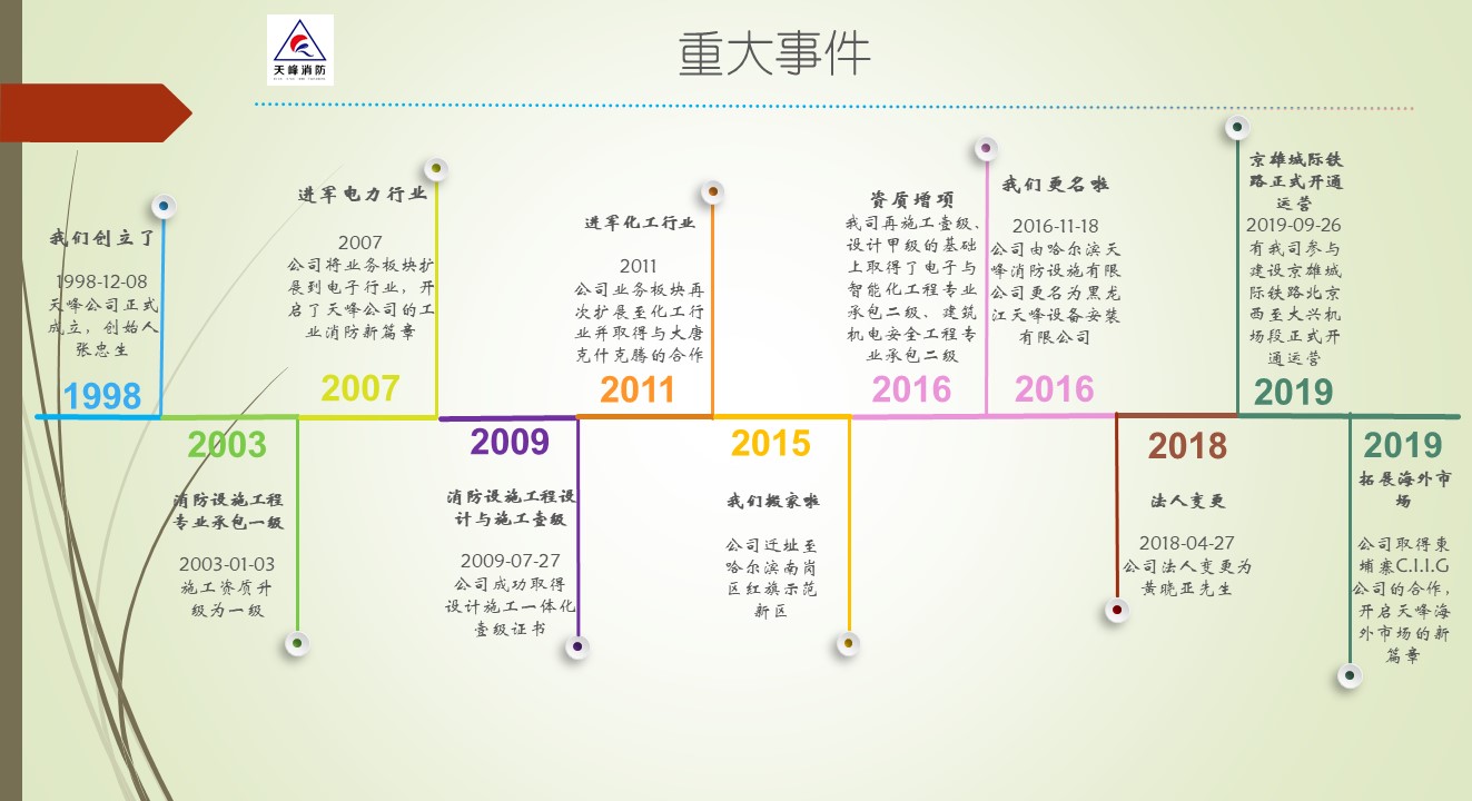 黑龙江天峰设备安装有限公司(以下简称:天峰消防)创立于1998年,主要承接能源化工、石化、电力、轨道交通、冶金、城市管廊等工业行业消防系统工程,可为客户提供特殊消防系统的详细设计、供货、施工等集成服务,天峰消防将依靠自身实力和信誉实现“立足龙江,布局全国,走向海外”的目标。